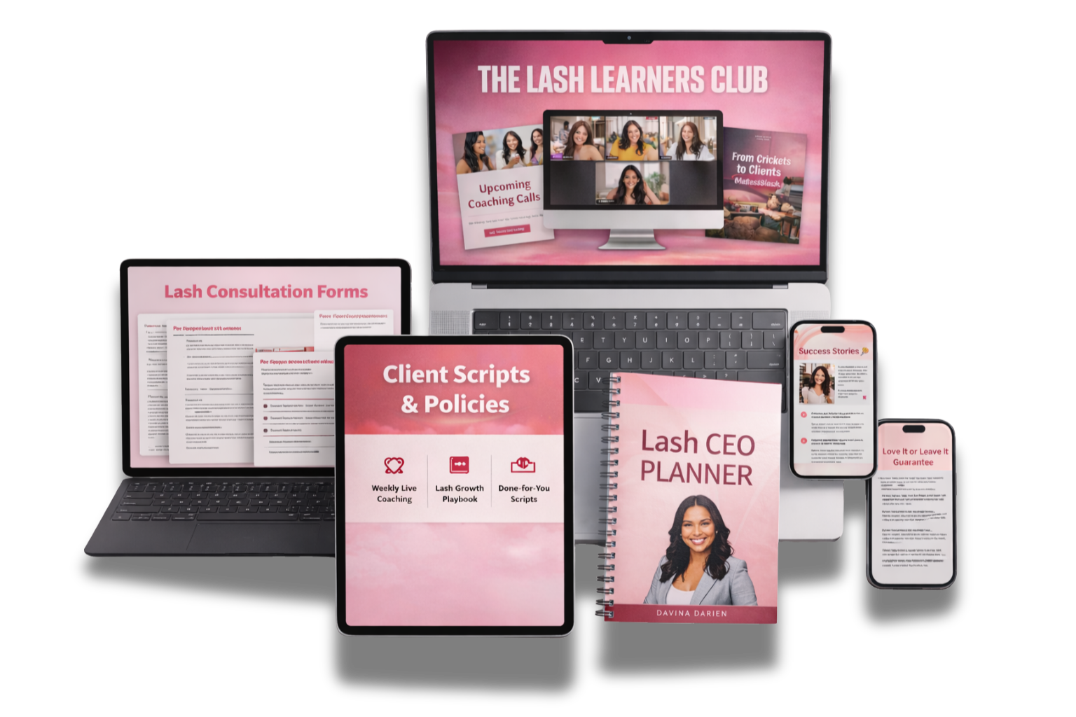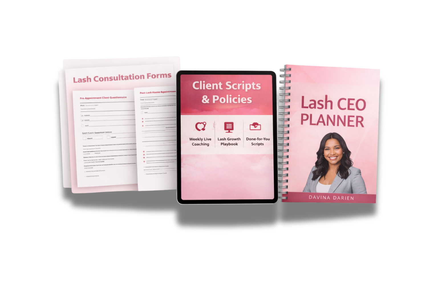 Inside, you get lash consultation forms, client scripts & policies, and the ultimate lash CEO planner.